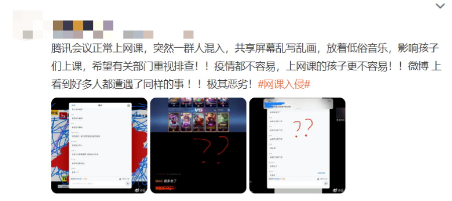 至于網(wǎng)課信息的泄露,一種可能,學(xué)生將自己的網(wǎng)課會議號或者密碼不經(jīng)意間,發(fā)布在社交平臺上,甚至有個別學(xué)里應(yīng)外合,故意“泄密”;另一種情形,有人組建QQ群,有組織地入侵網(wǎng)課課堂,擾亂課堂秩序,還在QQ群內(nèi)分享入侵的狀況。在群聊中,有網(wǎng)友表示未成年,稱自己輟學(xué)或者暫時無課,試圖搞惡作劇,并且無視自己的行為對其他學(xué)生造成了不良影響。